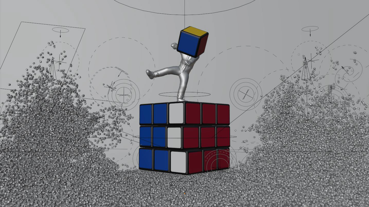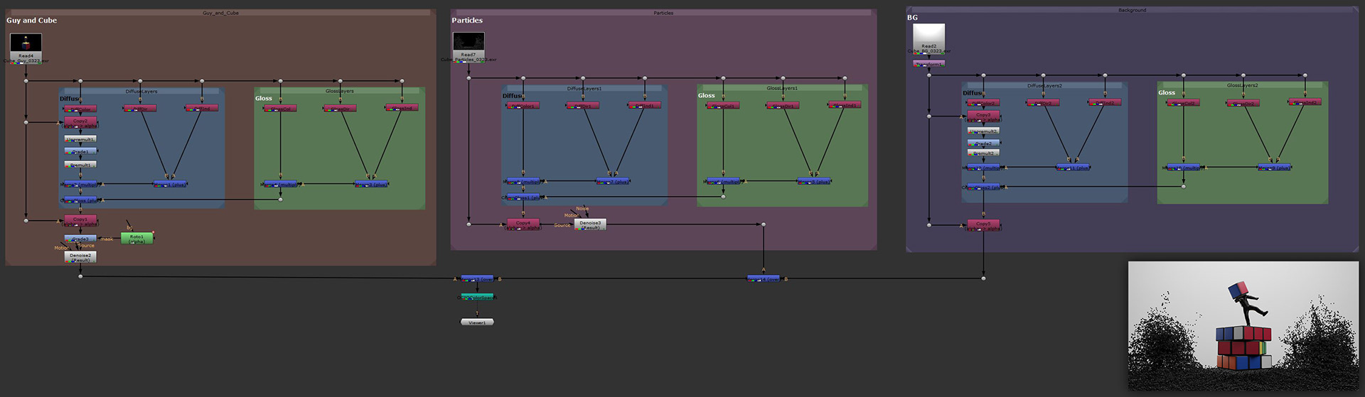 I went into this project knowing I wanted to composite in Nuke. The shots with the small black particles (like the one in the bottom right of the pic above) needed a LOT of samples in rendering as they were very glossy. With renders taking so long and being so intense (my computer sounded like Toy Story 2 Wheezy Crying for a lot of this one), I knew I needed to be able to lock down the final look of each shot in compositing rather than entirely in 3D/Lighting in Blender. I also wanted to be able to apply the right amount of de-noise to each element separately as to avoid losing important detail in the clouds of small cubes.